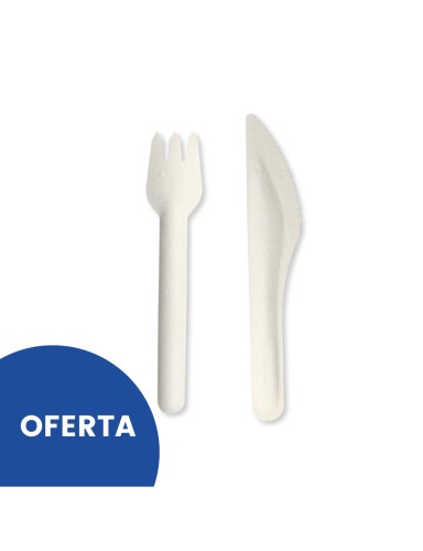 Cuchillo + Tenedor de bagazo de pulpa de caña de azúcar, 100% compostable.
